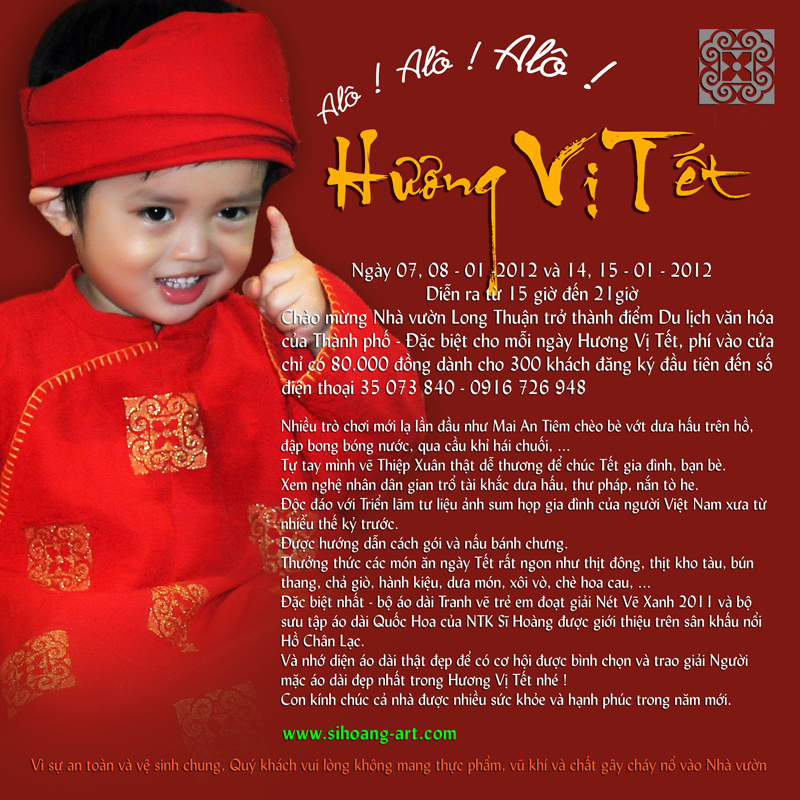 Sẽ khai mạc tại Nhà Vườn LONG THUẬN vào đêm trăng rất đẹp Thứ Bảy 07 / 01 / 2012 và sẽ tiếp tục trong các ngày 08, 14, 15 / 01 / 2012 HƯƠNG VỊ TẾT với khách mời danh dự - Nhà Sử học NGUYỄN KHẮC THUẦN và Nhà Tâm lý LÝ THỊ MAI sẽ chia sẻ với quý khách câu chuyện ngày Tết thật sâu sắc và ý nghĩa. HƯƠNG VỊ TẾT rất vui với trò chơi mới lần đầu tiên ĐUA BÈ VỚT DƯA, dựa trên sự tích trái dưa hấu Mai An Tiêm. Cùng trò chơi đập bong bóng nước may mắn, đập heo đất nhận lộc hên ! HƯƠNG VỊ TẾT có cả gánh Sơn đông mãi võ với những màn biểu diễn lạ kỳ như cảnh tượng chợ quê Tết ngày xưa. Đăng ký ngay đến số điện thoại 35 073 840 và 0916 726 948 để giữ chỗ Quý khách nhé ! Đặt lấy vé tại Nhà triển lãm Mỹ thuật ( Dinh Độc lập ) 135 Nam Kỳ khởi Nghĩa. Quận 1, Tp.HCM