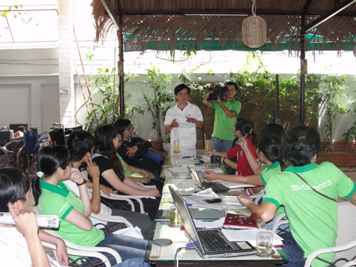 Những kĩ năng viết cơ bản; sự khác biệt khi viết tin, bài cho báo in và báo trực tuyến; cách trích dẫn nguồn; vài kĩ năng để có một bức hình đẹp….đều BTC chia sẻ tại buổi trao đổi. Bên cạnh đó, các bạn còn được học hỏi thêm một số kĩ năng quay phim cần thiết từ anh Tuấn đến từ Công ty Cổ phần Nghe nhìn Toàn cầu AVG. Anh Tuấn đang hướng dẫn kỹ thuật quay phim