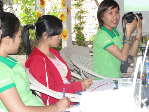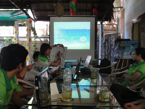 Không chỉ thu hút sự tham gia của các thành viên trong MXH Sống xanh, buổi trao đổi còn thu hút được các bạn sinh viên từ các trường Đại học quan tâm về kĩ năng viết. Tại đây, các bạn đã thoải mái nêu ra những khó khăn của mình khi bắt đầu viết để từ đó cùng nhau trao đổi và tìm ra phương thức khắc phục. Bạn Lương Thị Huyền Trâm- sinh viên Đại học Kinh tế chia sẻ “Mình rất thích viết và cũng đã từng viết nhiều thế nhưng mình vẫn còn gặp khó khăn khi viết lời dẫn nhập. Viết phần này mình thấy khá mất thời gian và khó vì không biết viết thế nào để hấp dẫn…”. Hồng Liên đang dẫn chứng ví dụ từ báo in