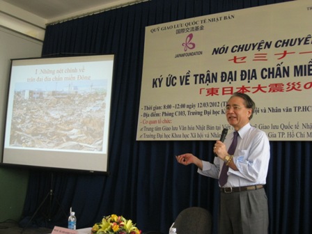 SốngXanh.vn- Chương trình chiếu phim tư liệu và Thuyết trình về trận đại địa chấn miền Đông Nhật Bản ngày 11/3 một năm về trước đã diễn ra trong nhiều tình cảm xúc động của hơn 200 giảng viên, sinh viên, học sinh tại trường ĐH KHXH &NV TP.HCM sáng ngày 12/3. Nhật Bản: Không được đánh mất lòng kiêu hãnh! Trong suốt 1 giờ say sưa với bộ phim tư liệu mà người Nhật gọi đó là “Lòng biết ơn của chúng tôi đối với tình hữu nghị của thế giới”, có rất nhiều giọt nước mắt tiếp tục rơi khi chứng kiến một lần nữa những mất mát to lớn mà người dân vùng Đông Bắc Nhật Bản phải hứng chịu. Trận động đất lớn thứ 4 thế giới trong hai thế kỉ 20 & 21 đã gây nên trận sóng thần kinh hoàng cướp đi mạng sống của 15.854 người, làm bị thương 6.023 người và khiến cho 3.276 người bị mất tích (theo thống kê vào ngày 2/3/2012, nguồn: Cơ quan Cảnh sát Quốc gia Nhật Bản). Một đất nước Nhật Bản nhỏ bé trên bản đồ Thế giới phải hứng chịu những con số mất mát vô cùng to lớn.