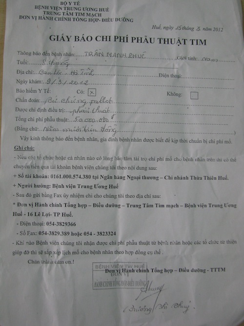 Mọi giúp đỡ xin liên hệ: Bệnh viện TƯ Huế Đơn vị Hành chính Tổng hợp – Điều dưỡng – Trung tâm Tim mạch Số TK: 0161000574380 tại Ngân hàng Ngoại Thương – Chi nhánh Thừa Thiên Huế 16 Lê Lợi – TP.Huế 054. 3829366