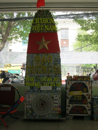 Sản phẩm “Cột cờ đảo Trường Sa” trường tiểu học Huỳnh Kiến Hoa, Q.5 đoạt giải Khuyến khích. Toàn bộ sản phẩm sử dụng 100% vỏ hộp sữa
