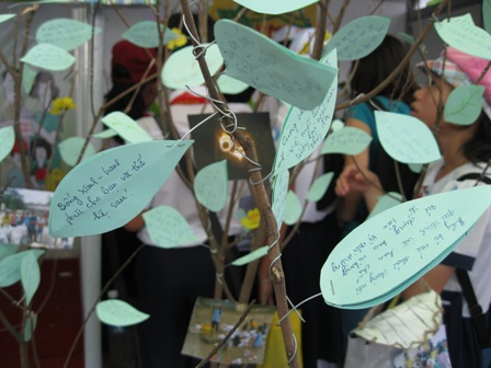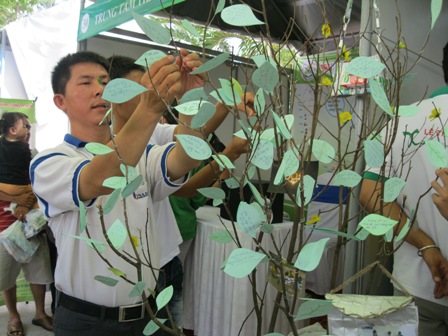 Một hoạt động rất thú vị của CLB Yêu môi trường (ĐH Nông Lâm TP.HCM) đó là viết các thông điệp về môi trường treo lên cây. Ngoài ra, nếu bạn trả lời các đúng các câu hỏi trắc nghiệm liên quan đến môi trường, bạn sẽ nhận được quà thú vị