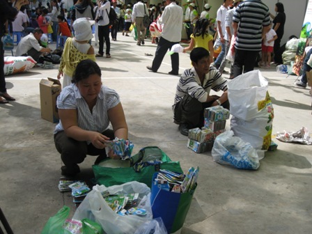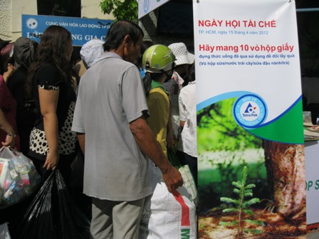 Sống Xanh.vn- Sáng 15/4, hàng trăm học sinh, sinh viên, công nhân viên chức, người lao động đã có mặt tại Cung Văn hóa Lao động để hưởng ứng nhiệt tình ngày hội Tái chế chất thải do Sở Tài nguyên – Môi trường TP.HCM phối hợp với Quỹ Tái chế chất thải TP.HCM tổ chức. Với 34 gian hàng, trong đó có gian hàng đổi chất thải nguy hại lấy quà, gian hàng đổi vỏ chai PET và vỏ lon, gian hàng trao đổi đồ cũ, 7 gian hàng trò chơi thu hút đa số học sinh, sinh viên. Ngày hội còn là cơ hội để các câu lạc bộ liên quan đến môi trường như: CLB Đạp xe vì môi trường, CLB Go Green, tổ chức Hành động vì Động vật hoang dã thu hút thêm các tình nguyện viên. Ngày hội cũng góp phần quảng bá cho các dịch vụ, sản phẩm thân thiện với môi trường như túi tự hủy, đồ nội thất làm từ vật dụng tái chế đến gần hơn với đông đảo công chúng. Chị Dung (Q.3, TP.HCM) vui vẻ cho biết chỉ mới biết về ngày hội từ hôm qua, nhưng chị đã vận động con cháu trong nhà gom góp vỏ hộp, vỏ chai các loại để tham gia đổi lấy quà trong ngày hội tái chế. Đến với ngày hội, chị Dung mới vỡ lẽ trước giờ toàn vứt bỏ chất thải nguy hại cùng với rác thải sinh hoạt thông thường. Chị nói “từ bây giờ chắc chắn chị sẽ phân loại riêng các loại rác rồi đem đến các điểm thu gom!”. Hào hứng tham gia các trò chơi, bạn Minh Trí – sinh viên trường Cao đẳng kinh tế đối ngoại cho rằng ngày hội đã giúp bạn “thức tỉnh” ra nhiều điều mà trước kia bạn không để ý đến. Ví dụ như bây giờ bạn có ý thức hơn trong việc giữ lại những món đồ có thể tái sử dụng mà không vứt đi tùy tiện như trước nữa. Ngày hội Tái chế chất thải 2012 còn cung cấp nhiều thông tin thú vị và bổ ích cho công chúng như: “Đến 60% những thứ bạn vứt vào thùng rác có thể được tái chế. Đến 50% rác thải gia đình có thể làm phân compost. 100% thủy tinh đã sử dụng có thể tái chế. Thủy tinh cho vào bãi chôn lấp không bao giờ phân hủy. Tái chế giấy chỉ cần 70% năng lượng và sinh ra ít hơn 73% ô nhiễm so với việc sản xuất giấy từ nguyên liệu thô. Tái chế một chiếc hộp thiếc có thể tiết kiệm năng lượng đủ để mở tivi trong 3 giờ. Tái chế 1 chai thủy tinh có thể tiết kiệm năng lượng để phát cho máy tính trong 25 phút. Tái chế 1 chai nhựa có thể tiết kiệm năng lượng đủ để phát bóng đèn 60W trong 3 giờ”. Sống Xanh đã ghi lại những hình ảnh náo nhiệt trong ngày hội: