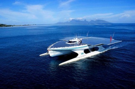 4. Tàu mặt trời lớn nhất thế giới TURANOR PlanetSolar được mệnh danh là con tàu chạy bằng năng lượng mặt trời lớn nhất thế giới, do Thụy Sỹ thiết kế và được sản xuất tại Đức. Tàu có trọng lượng 60 tấn, dài 31m, rộng gần 16m, với một tấm pin mặt trời có diện tích hơn 500m2. Tàu có thể đạt tốc độ tối đa khoảng 25km/giờ, phù hợp cho các chuyến viễn du dài ngày trên biển.