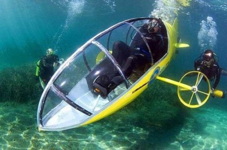6.Tàu ngầm đạp chân Scubster Chiếc tàu ngầm chạy bằng sức người đầu tiên trên thế giới với thiết kế nhỏ gọn có tên gọi Scubster này do một nhóm kỹ sư người Pháp sáng tạo ra. Scubster được thiết kế để người lái chỉ phải đạp bàn đạp để tạo lực di chuyển dưới nước. Tùy theo sức đạp của người điều khiển, tàu có thể đạt tới vận tốc 8km/giờ và lặn xuống độ sâu 6m. Đây là phương tiện rất thích hợp cho những chuyến du ngoạn, tham quan vùng sông nước và vùng biển nông.