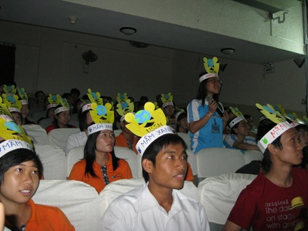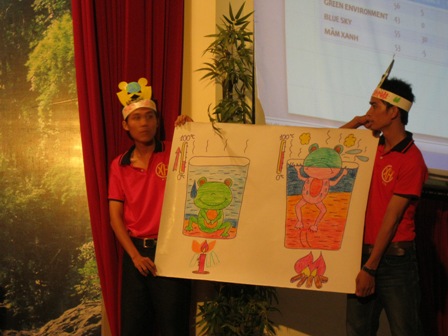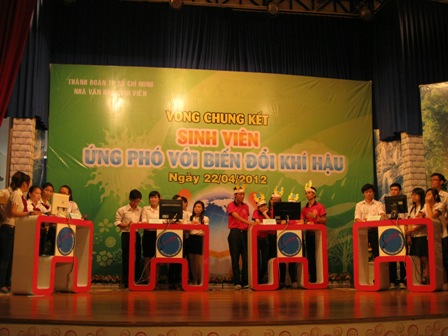 SốngXanh.vn- Sáng 22/4, hơn 200 sinh viên đã có mặt tại hội trường lầu 4 NVH Sinh viên để hào hứng tham gia và cổ vũ vòng chung kết cuộc thi “Sinh viên ứng phó với biến đổi khí hậu” do Thành Đoàn TP.HCM và NVH Sinh viên phối hợp tổ chức. Ngay cả khi gửi gắm tình yêu và thông điệp dành cho môi trường thì dí dỏm, vui nhộn và máu lửa – vẫn là những yếu tố làm nên “chất” rất sinh viên! Giải cứu Trái Đất! Ngay từ vòng thi đầu tiên “Xin chào màu xanh” 4 đội chơi: Green Environment (Đại học Sài Gòn), Green Cat (Đại học Công nghiệp), Blue Sky (Đại học Quốc tế Hồng Bàng) và Mầm Xanh (Đại học KHXH&NV) đã làm bất ngờ cả ban giám khảo lẫn khán giả. Với Đội Green Cat, thật thú vị khi các bạn sử dụng câu chuyện về một chú sóc tìm chỗ giấu hạt dẻ nhưng khắp nơi đều bao quanh bởi băng tan. Và người đứng ra bảo vệ, giải cứu Trái Đất chính là 4 thành viên đến từ đội Green Cat. Một lời giới thiệu dí dỏm, ấn tượng, nói được vấn đề môi trường, đội Green Cat đã nhận được sự cổ vũ nhiệt tình từ khán giả.
