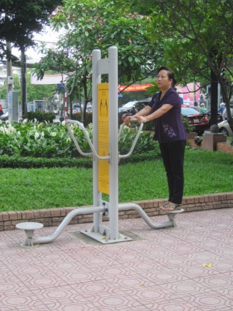 Tuy nhiên, nhiều người vẫn ngại làm quen với các dụng cụ thể dục này vì không biết sử dụng. Để khắc phục tình trạng trên, nhiều công viên cũng có các bảng hướng dẫn các động tác kèm theo từng dụng cụ. Điều này giúp ích rất nhiều cho người tập, đặc biệt là những người lần đầu tiên biết đến các dụn cụ này. Công viên “hút khách” nhờ các dụng cụ thể dục miễn phí Ngay từ thời gian đầu thực hiện, mô hình này đã được người dân nhiệt tình hưởng ứng. Người dân đến công viên để tập thể dục ngày càng đông hơn và tất cả đều rất thích thú với các dụng cụ miễn phí này. Chị Nguyễn Thị Thanh Xuân vừa sử dụng dụng cụ xoay chân vừa hứng thú cho biết “Các dụng cụ này sử dụng rất dễ. Sau hai, ba lần là sử dụng quen rồi. Mỗi ngày bỏ ra chừng một tiếng ở đây đã có thể sử dụng được hết các dụng cụ. Tập với các dụng cụ này rất tốt cho sức khỏe”.