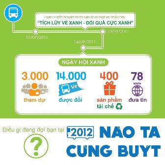 NTCB 2012 gồm 2 giai đoạn bao gồm: · Giai đoạn 1: - Thời gian triển khai: Từ ngày 15/07 đến ngày 16/09/2012 - Địa bàn triển khai: TP. Hồ Chí Minh, TP. Thủ Dầu Một – BD, TP. Biên Hòa – ĐN. - Nội dung triển khai: + Tuyển mộ, Tập huấn đội hình cộng tác viên (20 người) và các đội hình tình nguyện viên (100 người) những thông tin về dự án, hướng dẫn thực hiện công việc và triển khai hoạt động dự án. + Triển khai thu gom vé xe buýt và quy đổi phiếu điểm tại các điểm thu gom (Bao gồm: Các trường Đại học, Cao đẳng, TCCN, THPT trên địa bàn TP.HCM, Bình Dương và Đồng Nai) +Tổ chức ít nhất một cuộc thi đồng hành trực tuyến (online) nhằm mục đích truyền thông dự án và nâng cao nhận thức của cộng đồng mạng trong vấn đề mà dự án hướng đến. + Tọa đàm “Xe buýt trong mắt giới trẻ” vào lúc 8h sáng ngày 09/09/2012 1. Tạo điều kiện cho giới trẻ và những đối tượng sử dụng xe buýt và phương tiện công cộng (PTCC) có điều kiện gặp gỡ và trao đổi với các nhà chức trách về những vấn đề về môi trường và PTCC, nhất là xe buýt. 2. Tạo điều kiện cho các nhà quản lý, các nhà chức trách nêu lên được thực trạng của việc bảo vệ môi trường và PTCC hiện nay, đồng thời cũng tạo cơ hội cho các nhà quản lý, các nhà chức trách trao đổi những khó khăn, những mong muốn, và kế hoạch cho việc cải thiện môi trường và chất lượng của việc vận tải công cộng trong thời gian tới. 3. Tạo sự quan tâm, thu hút sự chú ý của cộng đồng cho sự kiện chính Ngày Hội Chuyển Động Xanh nói riêng và dự án Nào Ta Cùng Buýt 2012 nói chung. · Giai đoạn 2: - Thời gian triển khai: 8h sáng 23/09/2012 - Địa điểm triển khai: Công viên VH Lê Thị Riêng (Quận 10, TP.HCM) - Nội dung triển khai: + Xây dựng và thực hiện Ngày Hội Chuyển Động Xanh 2012 với mô hình một ngày hội hành động vừa học vừa chơi, truyền đạt các thông tin tuyên truyền đến với người tham quan thông qua các hoạt động, các khu vực gian hàng sôi động, thu hút – trực quan sinh động bằng những hành động cụ thể. + Các hoạt động tiêu biểu được đề xuất như: Đổi vé xe buýt lấy quà tặng, “Nghệ thuật Chuyển Động Xanh”, Thực hiện bức tranh kỷ lục về môi trường bằng 10.000 vé xe buýt hay những vũ điệu flash mob sôi động… Hướng truyền thông chính tại: