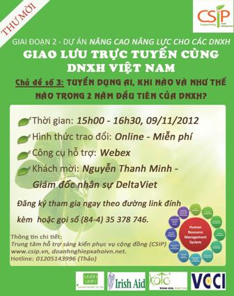 Tiếp nối sự thành công giai đoạn 1 của dự án "Nâng cao năng lực cho DNgXH" do sự tài trợ của Đại Sứ Quán Ai Len, Trung tâm Hỗ trợ Sáng kiến Phục vụ Cộng đồng (CSIP) trân trọng kính mời các cán bộ, nhân viên làm việc trong các DNgXH Việt nam tham gia chuỗi chương trình giao lưu trực tuyến từ tháng 10 - tháng 12/2012. Mục đích của chương trình nhằm thúc đẩy mạng lưới giao lưu kết nối và chia sẻ chuyên môn trong cộng đồng các Doanh Nghiệp Xã Hội Việt Nam (đã từng hoặc chưa tham gia các trong dự án). Qua kinh nghiệm thực tế của riêng CSIP lẫn của các cộng đồng tương tự khác, sự tham gia tích cực trong các mạng lưới sẽ giúp các tổ chức xây dựng nguồn vốn xã hội dồi dào, đa dạng cho tất cả nhằm hỗ trợ sự phát triển bền vững và ổn định. Với chủ đề thứ ba "Tuyển dụng ai, khi nào và như thế nào trong 2 năm đầu tiên của DNXH" cùng sự tham gia của Giám đốc nhân sự DeltaViet – Nguyễn Thanh Minh, sẽ được diễn ra lúc 15h00 đến 16h30, thứ 6, ngày 9/11/2012. Vì buổi giao lưu sử dụng công cụ Webex để kết nối mọi người qua internet, nên các anh chị xin vui lòng đăng ký theo đường link dưới đây hoặc liên hệ (84-4) 35 378 746 https://docs.google.com/spreadsheet/viewform?pli=1&formkey=dF9IMDhILVVLOThYWTE4U3Vja2JmUkE6MQ#gid=0 (Hướng dẫn sử dụng công cụ Webex được đính kém tại đây. Để được hỗ trợ kỹ thuật khi tham gia chương trình, vui lòng liên hệ: Hồng Minh: 0988.311.980/Mạnh Tiến: 0934480623/ Thảo: 01205143996). Ban tổ chức rất mong nhận được bản đăng ký tham gia và dành thời gian tham dự của các anh/chị.