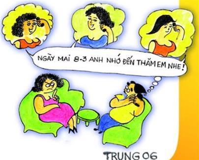 Qùa tặng 8/3. Các quí anh mua về tặng vợ ( hoặc sắp sửa là vợ ). Bảo đảm đẹp , chuẩn trong vòng nửa phút ( hiện bán tại siêu thị Toiyeuco) .   Riêng ngày hôm nay là em phải thể hiện cho anh biết ...!  Mọi ngày ông quát tháo  tôi Hôm nay ông chớ lôi thôi...liệu hồn !  Chịu khó cho hết ngày hôm nay ông ạ !  Đã sang mồng 9 tháng 3 Sao ta vẫn thấy "bà nhà" to  ghê !    Chưa có bao giờ đẹp như hôm nay !.., Này thì thăm này !  Ôi...! Sao không có ngày quốc tế đàn ông nhỉ...hu  hu...!  Các người theo ta trốn ngay lên rừng trong ngày 8/3 . Ta sẽ đệ đơn lên Liên hợp quốc, từ nay trở đi sẽ lấy ngày 3/ 8 là ngày quốc tế đàn ông ! Nguồn: vn.360plus.yahoo.com/trongkim0810 Tags: 8/3