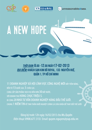 Học viện khởi nghiệp YUP kết hợp cùng Trung tâm hỗ trợ phục vụ sáng kiến cộng đồng (CSIP), với sự tài trợ của Công ty CP Đầu tư VNGlobal tổ chức chương trình “A NEW HOPE – Local Meeting. Global Networking. Entrepreneurship” với mục tiêu giao lưu kết nối cùng đoàn doanh nhân xã hội quốc tế thú vị này: