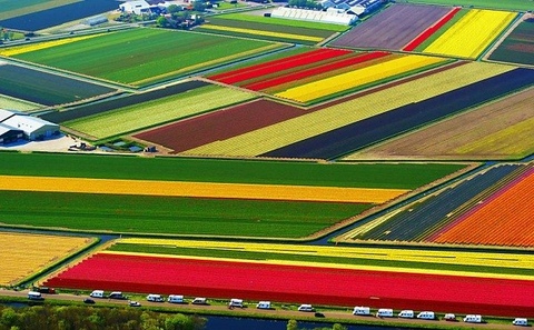![]() ![]() Nhìn từ trên cao xuống, những cánh đồng hoa tulip trông giống một tấm thảm khổng lồ được ghép từ nhiều mảnh vải nhỏ với muôn vàn màu sắc. Dường như tất cả màu sắc có thể có trên bảng màu họa sĩ đều hiện diện trên những cánh đồng hoa này.