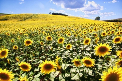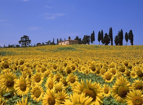 Một trong những cảnh tượng khiến con người cảm thấy thư thái yên bình nhất là cảnh những bông hướng dương trải vàng như một thảm nắng rực rỡ trên triền đồi. Và không ở nơi đâu, hoa hướng dương lại đẹp như ở Tuscany, Ý.