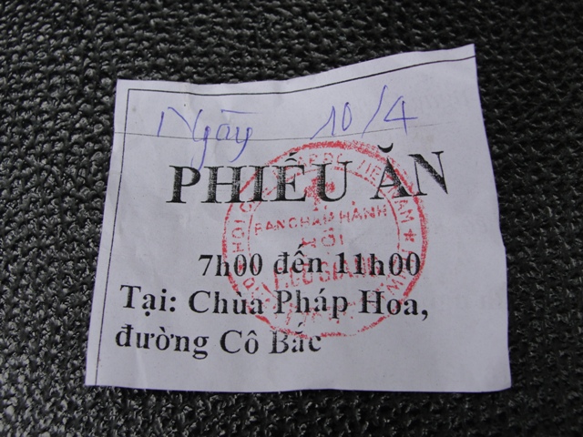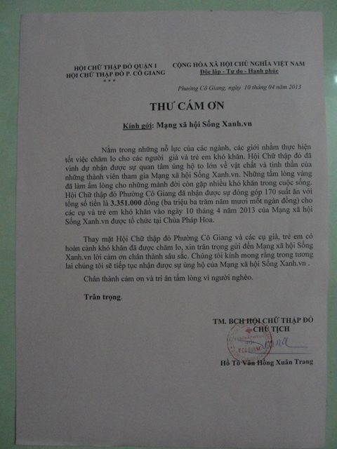 (SốngXanh.vn) Từ số tiền quyên góp được trong chương trình Giờ Trà chiều 3, Mạng Xã hội SốngXanh.vn sẽ phối hợp cùng Hội Chữ thập đỏ phường Cô Giang, quận 1 và Chùa Pháp Hoa (183 Cô Bắc, Phường Cô Giang, Quận 1 - Hồ Chí Minh) tổ chức nấu cơm chay tặng những hoàn cảnh khó khăn trong địa bàn phường vào ngày 9 vào 10 tháng 4, 2013.