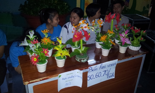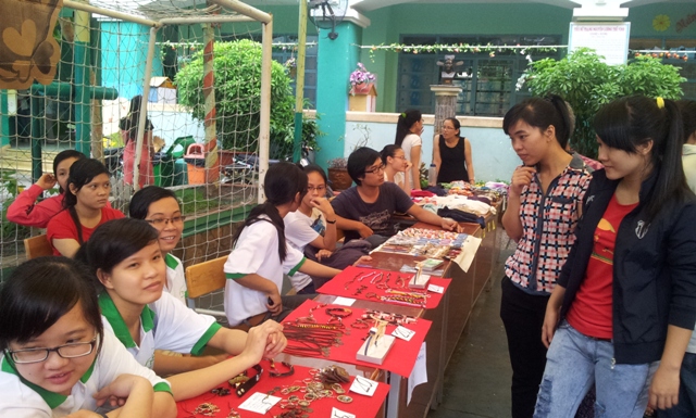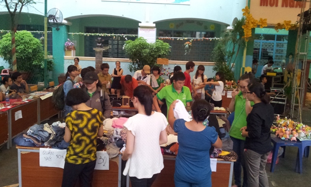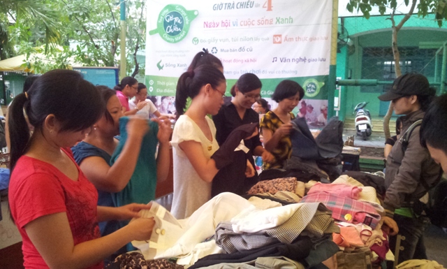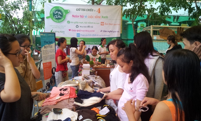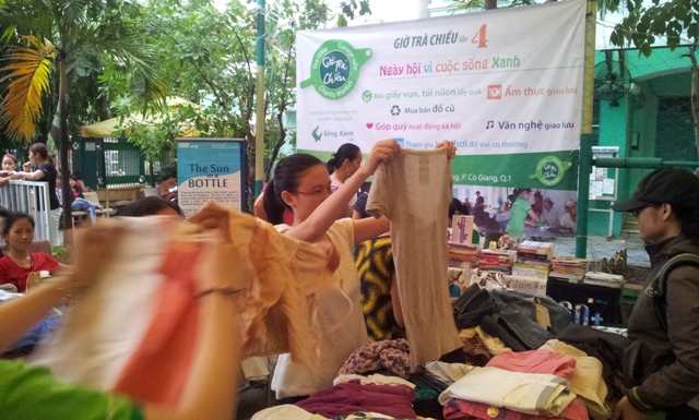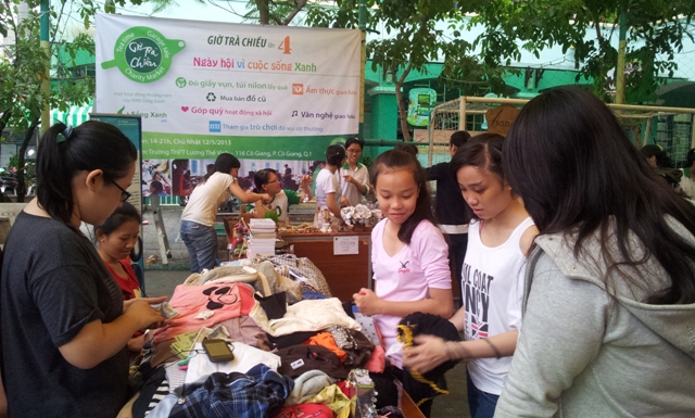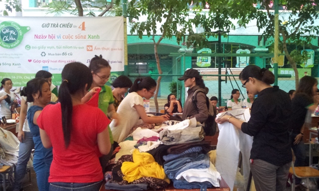 Các bạn TNV đang chuẩn bị gian hàng Sống Xanh bán quần áo túi xách đồ dùng cũ