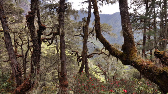 Một buổi chiều trên đường từ cố đô Punakha về khách sạn nằm ở thị trấn Wangdue, tôi bất ngờ nhìn thấy một cành thông khá lớn bổ ngang qua đường. Điều đáng nói là cành cây ấy lại uốn cong hình chữ V mà đáy của nó nằm ngay giữa tim đường, nếu không cẩn trọng khi ôtô chạy qua sẽ đâm vào đáy của đoạn cây uốn cong hình chữ V ấy. Và theo như logic thông thường, ở bất cứ xứ nào nhân viên công trình giao thông sẽ cưa ngay nhánh cây để đảm bảo an toàn.