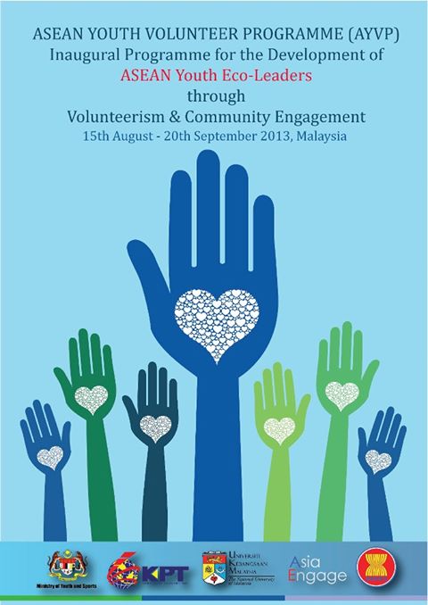 Chương trình tình nguyện cho giới trẻ Asean - The ASEAN Youth Volunteers Program (AYVP) có thể hiểu là tăng cường vai trò của công tác tình nguyện trong Kế hoạch tổng thể xây dựng cộng đồng văn hoá xã hội Asean (ASCC) và nỗ lực đưa Asean gần hơn tới người dân trong khu vực. Để thực hiện chương trình này, Trường đại học Kebangsaan Malaysia (UKM hoặc Đại học quốc gia Malaysia) được giao nhiệm vụ chỉ đạo, xây dựng và triển khai AYVP với sự hỗ trợ của Bộ Thanh niên và Thể thao Malaysia và Ban thư ký Asean. Chúng tôi rất hân hạnh được thông báo Ban thư ký AYVP dưới sự chủ trì của Asia Engage UKM đang chuẩn bị cho việc tổ chức Lễ khởi động chương trình những nhà lãnh đạo sinh thái trẻ ASEAN ở Malaysia từ ngày 15 tháng 8 đến ngày 20 tháng 9 năm 2013. Chúng tôi hi vọng nhận được sự ủng hộ nhằm phổ biến chương trình tới những người trẻ tuổi trong cộng đồng của các bạn.