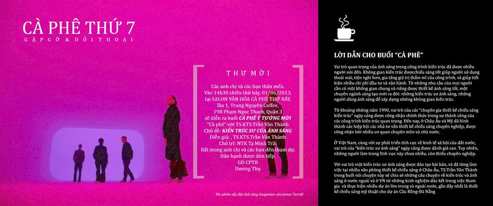THƯ MỜI CÀ PHÊ Ý TƯỞNG MỚI Chủ đề: KIẾN TRÚC SƯ CỦA ÁNH SÁNG Diễn giả: , TS.KTS Trần Văn Thành Chủ trì: KTS Phan Linh Rất mong anh chị và các bạn đến tham dự. Hân hạnh được đón tiếp. CLB Kiến Trúc Xanh TP. HCM
