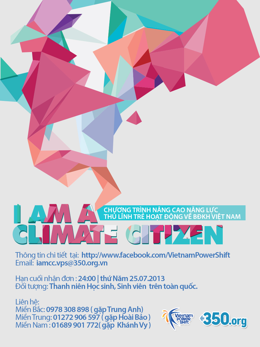 Bạn có đam mê, nhiệt huyết và bức xúc với các vấn đề môi trường, biến đổi khí hậu ? Bạn mong muốn đóng góp vào các giải pháp cho các vấn đề này nhưng chưa biết phải bắt đầu từ đâu? Bạn muốn xây dựng và trở thành thủ lĩnh phong trào về biến đổi khí hậu (BĐKH) ngay trong cộng đồng tại nơi bạn đang sống? Năm 2013 và 2014, 350.org Việt Nam cùng mạng lưới 350.org tại hầu hết các quốc gia phát động và thực hiện chiến dịch toàn cầu về BĐKH có tên gọi Global Power Shift vì một tương lai phát triển bền vững dựa trên các giải pháp về năng lượng sạch và thân thiện với môi trường. Chiến dịch tại Việt Nam, với tên gọi Vietnam Power Shift bao gồm một loạt các hoạt động và dự án diễn ra từ tháng 07.2013 tới hết năm 2014 trên cả nước. Với mục tiêu xây dựng và củng cố phong trào trên toàn quốc, trong khuôn khổ chiến dịch Vietnam Power Shift có một hoạt động trọng tâm là Chương trình nâng cao năng lực cho thủ lĩnh trẻ phong trào về BĐKH mang tên “I AM A CLIMATE CITIZEN” (tạm dịch: Công dân thời biến đổi khí hậu) Chương trình này dành cho 50 bạn trẻ có tố chất được lựa chọn trên khắp Việt Nam bao gồm một khoá tập huấn tại TP.HCM; sẽ là cơ hội cho các bạn được học và rèn luyện những kỹ năng đặc thù cần thiết cho việc xây dựng phong trào cộng đồng tại địa phương, tham khảo các chiến dịch cộng đồng về BĐKH đã thành công tại Việt Nam cũng như tại nhiều quốc gia trong khu vực và trên thế giới. Bên cạnh đó, khi được lựa chọn là một “Climate Citizen”, các bạn cũng sẽ cùng tham gia các dự án sôi động của Vietnam Power Shift cũng như nhiều hoạt động khác của 350 Việt Nam, và trong những năm tới sẽ đóng vai trò là những thành viên nòng cốt trong phong trào về BĐKH, tạo nên những thay đổi tích cực từ chính nơi bạn đang sinh sống nhằm xây dựng tương lai bền vững cho Việt Nam. Xem thêm thông tin trên trang Facebook http://www.facebook.com/VietnamPowerShift hoặc trang 350.org Việt Nam http://www.facebook.com/vietnam350