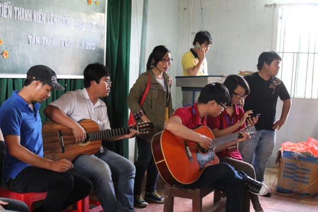 Thành viên của CLB còn dàn dựng các tiết mục, kịch, hát, ảo thuật phục vụ các em nhỏ và bà con nơi đây Ảnh: Hài kịch do TNV CLB Thiện Tâm biên đạo và diễn xuất