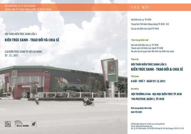 Hội Kiến trúc sư TP. Hồ Chí Minh, Trung tâm Tiết kiệm Năng lượng TP. Hồ Chí Minh và CLB Kiến trúc trúc Xanh TP.HCM trân trọng thân mời bạn tham dự buổi Hội thảo Kiến trúc Xanh lần 3: Kiến trúc Xanh - Trao đổi & Chia sẻ