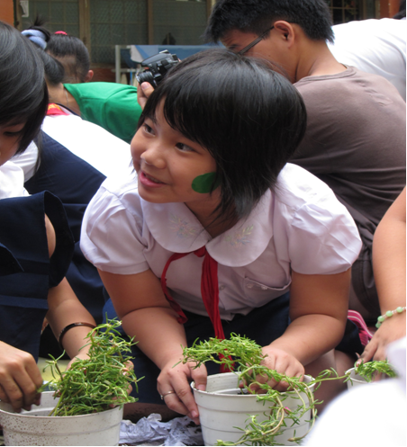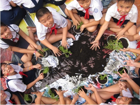 Sau những giờ học lý thuyết, đã đến lúc các em bắt tay vào thực hành – trồng cây. Khi đã được hướng dẫn về cách trồng và tưới cây sao cho cây phát triển thật tốt, các em được xuống sân và mỗi em sẽ trồng cho mình một chậu cây nhỏ. Dường như việc tự tay trồng cây đã khiến các em cảm thấy hào hứng và nhớ lại bài học một cách dễ dàng hơn hẳn