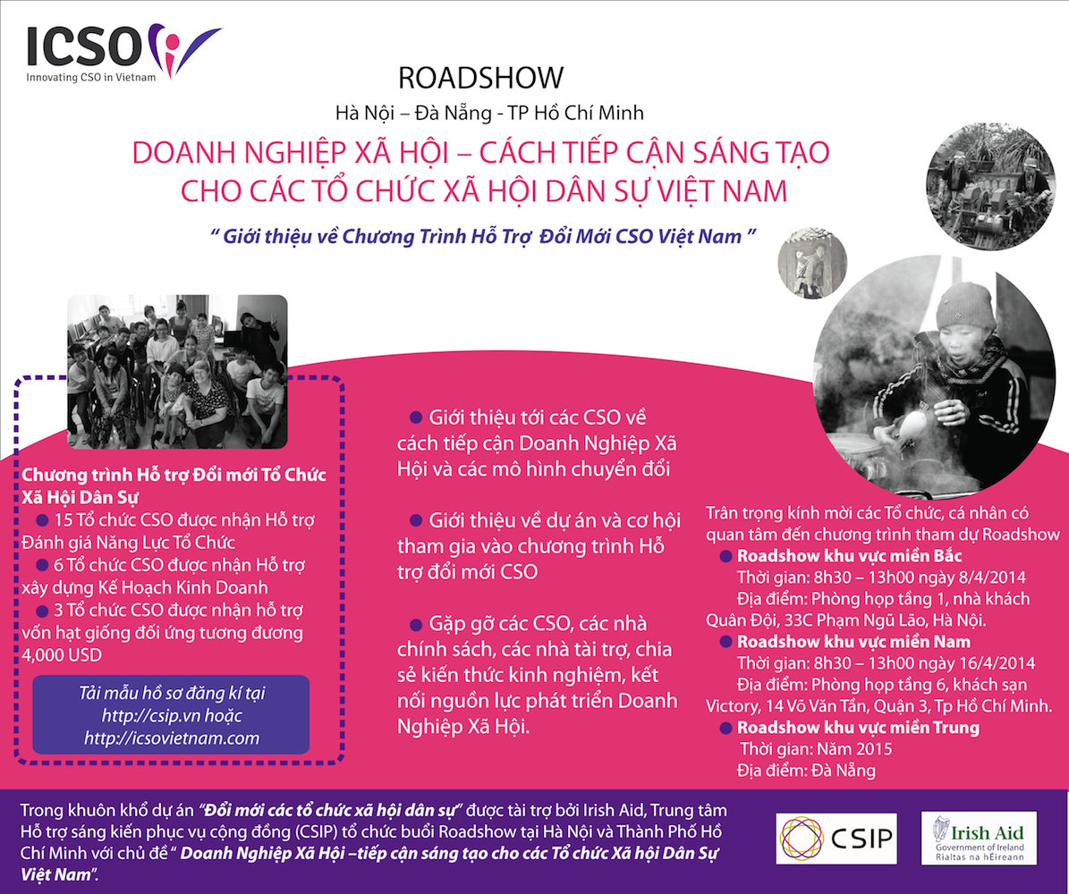 Với sự tham gia của các nhà chính sách, nhà tài trợ và các CSOs, Roadshow là diễn đàn giới thiệu, thảo luận giữa các bên về vai trò của các CSO và triển vọng cho các tổ chức này phát triển theo định hướng Doanh Nghiệp Xã Hội. Rất mong nhận được sự quan tâm và tham gia của các anh/chị. Vui lòng đăng kí tham dự Roadshow tại đường link: http://bit.ly/1iz4TvU hoặc liên hệ Hồng Dương – Văn phòng CSIP (điện thoại: 04 3537 8746 Trân trọng cảm ơn và hẹn gặp lại các anh chị! CSIP Team