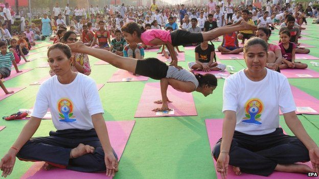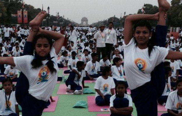 Những người đam mê Yoga đã luyện tập trong một tháng trước khi sự kiện bắt đầu. Ảnh: BBC Bà Swaraj cho biết mình sẽ có mặt ở New York, nơi bà sẽ tham dự lễ kỷ niệm với Tổng thư ký Liên Hợp Quốc Ban Ki-moon. Trong Times Square, 30.000 người được dự kiến tham gia tập yoga. Ngày này được quảng bá là để thúc đẩy "sự hòa hợp và hòa bình", nhưng nó đã đánh một lưu ý gây tranh cãi với một số tổ chức Hồi giáo nói rằng yoga cơ bản là thực hành tôn giáo Hindu và chống lại đạo Hồi. Nhiều người khác nói chính phủ Hindu của ông Modi có một chương trình nghị sự trong việc thúc đẩy các kỷ luật cổ xưa của Ấn Độ. Tuy nhiên, các nhà chức trách phủ nhận, họ nói tham gia trong ngày yoga là không bắt buộc và người Hồi giáo phản đối yoga là phóng đại. Ngày Quốc tế Yoga với số lượng: