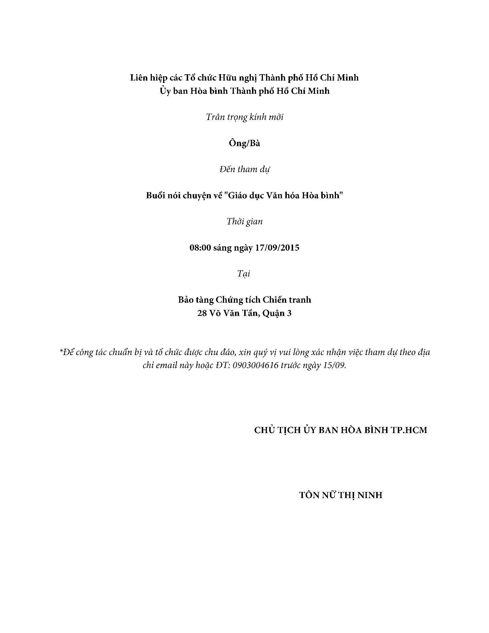 Chương trình 1. Tuyên bố lý do - Giới thiệu đại biểu. 2. Các bài phát biểu. 2.1. Bà Tôn Nữ Thị Ninh, Chủ tịch Ủy ban Hòa bình TP.HCM; Cựu Đại sứ Việt Nam bên cạnh Liên minh Châu Âu; Nguyên Phó Chủ nhiệm Ủy ban Đối ngoại Quốc hội. Báo cáo trao đổi: 70 năm thảm họa Hiroshima và phong trào giải trừ quân bị hạt nhân. Một số định hướng cho việc xây dựng và giáo dục về văn hóa hòa bình ở Tp. Hồ Chí Minh. 2.2. PGS.TS. Hà Minh Hồng, Trưởng Bộ môn Lịch sử Việt Nam, Khoa Lịch sử, ĐH Khoa học Xã hội và Nhân văn TP.HCM. Báo cáo trao đổi: Một số khái niệm về hòa bình ở Việt Nam. 2.3. Bà Huỳnh Ngọc Vân, Giám đốc Bảo tàng Chứng tích Chiến tranh. Báo cáo trao đổi: Giáo dục hòa bình - Vai trò và tính cấp thiết. 3. Trao đổi, thảo luận. 4. Tổng kết sự kiện.