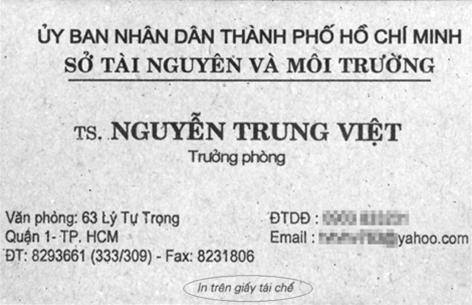 Hôm họp mặt chuyên gia, cộng tác viên để góp ý hình thành chuyên trang môi trường, mọi người đều “ồ” lên thích thú khi nhận danh thiếp của tiến sĩ Nguyễn Trung Việt - trưởng phòng xử lý chất thải rắn Sở Tài nguyên - môi trường TP.HCM. Danh thiếp của tiến sĩ Việt không có mùi thơm, không lộng lẫy, in trên giấy cứng, vàng, chữ xanh rất dễ đọc. Đặc biệt, cuối danh thiếp có một dòng chữ nhỏ “in trên giấy tái chế”.